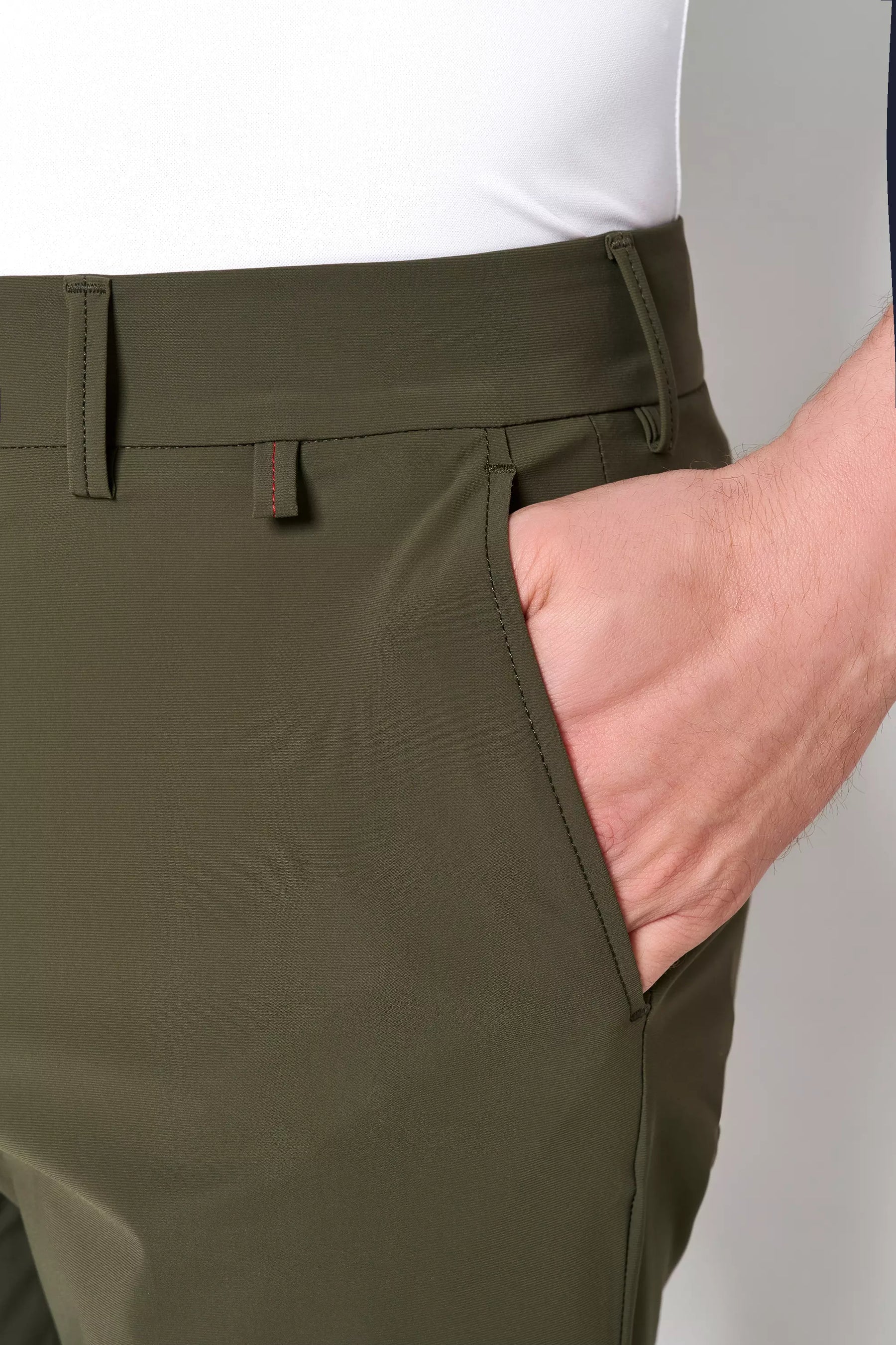 Detailansicht der 4798-92975 PURE Functional Bermuda in Grün mit seitlicher Eingrifftasche. Hochwertige Verarbeitung für maximalen Tragekomfort.
